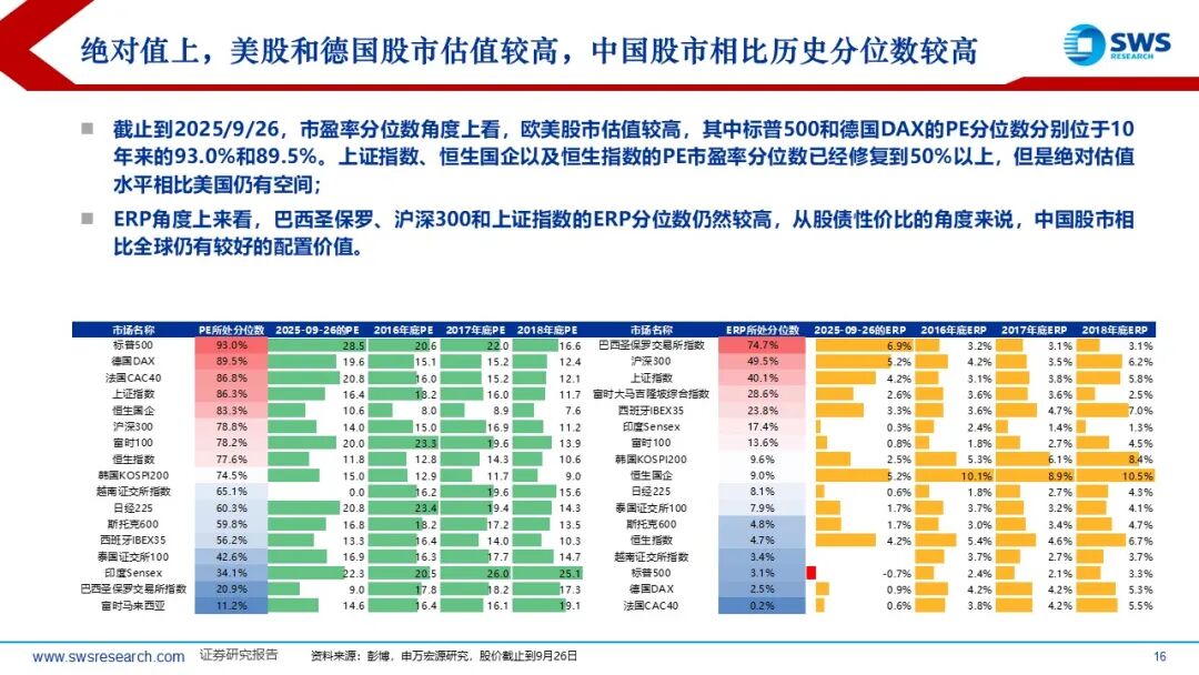本周A股指数的ERP保持基本稳定。截止到2025/9/26,市盈率分位数角度上看,欧美股市估值较高,其中标普500和德国DAX的PE分位数分别位于10年来的93.0%和89.5%。上证指数、恒生国企以及恒生指数的PE市盈率分位数已经修复到50%以上,但是绝对估值水平相比美国仍有空间;ERP角度上来看,巴西圣保罗、沪深300和上证指数的ERP分位数仍然较高,从股债性价比的角度来说,中国股市相比全球仍有较好的配置价值。截止到2025/9/26,标普500的风险调整后收益所处分位数由51%下降至49%,纳斯达克的风险调整后收益所处分位数由48%下降至45%。沪深300的风险调整收益分位数从79%下降至76%。发达市场和新兴市场的风险调整收益分位数边际下降,其中新兴市场的风险调整后收益分位数下降约 10 Pcts。