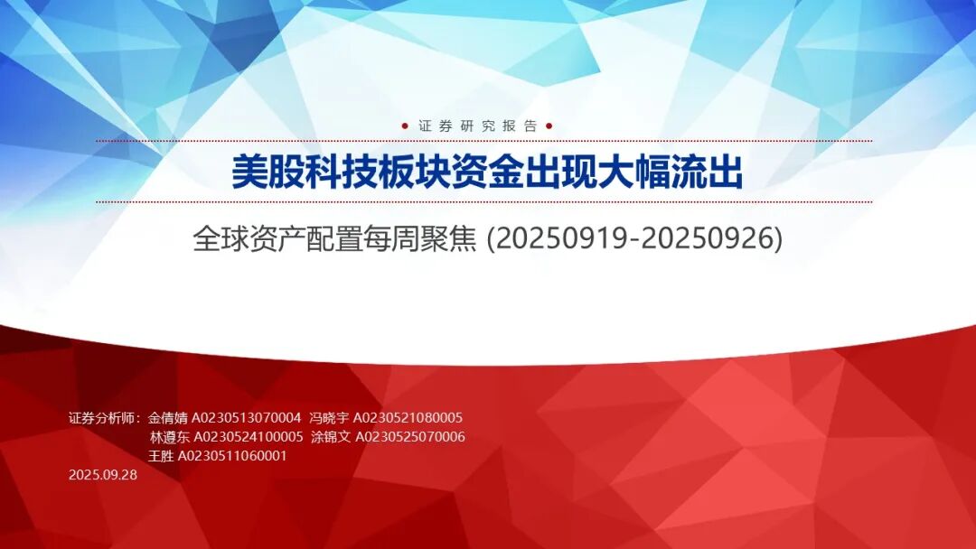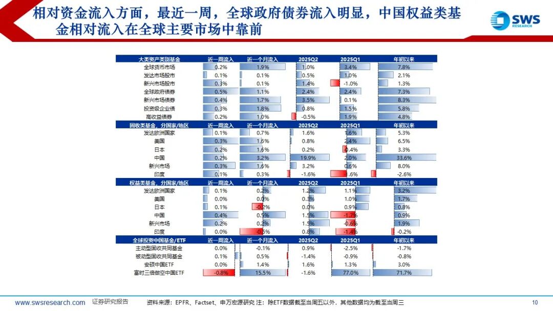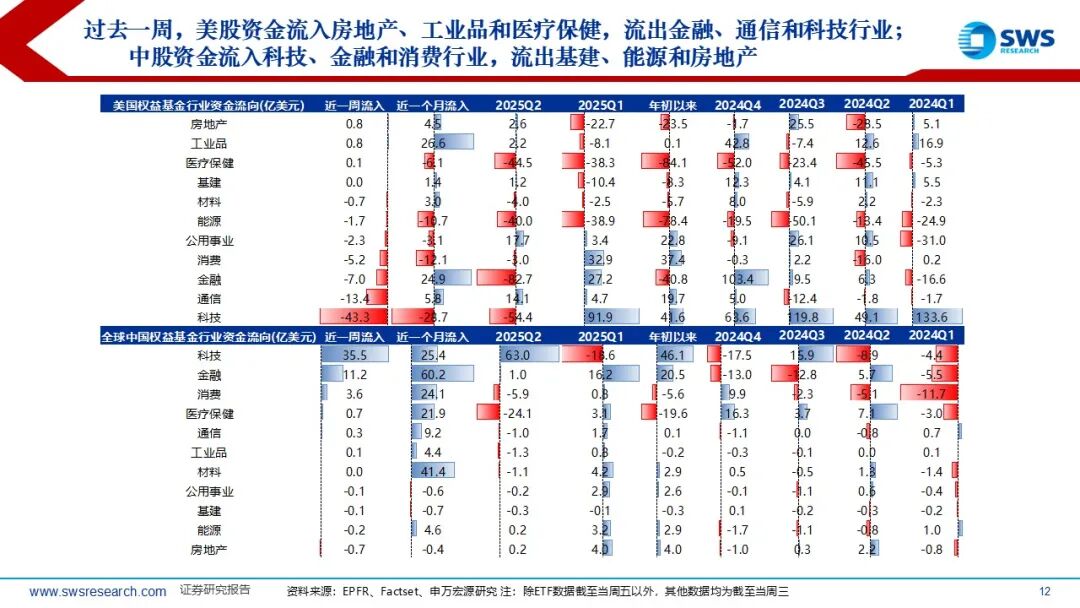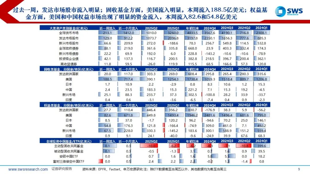 截止到2025/9/24,过去一周来看,内资和外资均大幅流入中国股市。海外资金主动和被动方面,海外主动基金过去一周流出2.19亿美元,而海外被动基金过去一周流入26.99亿美元;内资和外资方面,内资过去一周流入29.83亿美元,而外资过去一周流入24.80亿美元。过去一周,发达市场股市流入明显;固收基金方面,美国流入明显,本周流入188.5亿美元;权益基金方面,美国和中国权益市场出现了明显的资金流入,本周流入82.6和54.8亿美元;过去一周,美股资金流入房地产、工业品和医疗保健,流出金融、通信和科技行业;中股资金流入科技、金融和消费行业,流出基建、能源和房地产。本周美股科技板块流出43.3亿美元,而中国股市科技板块则流入35.5亿美元。