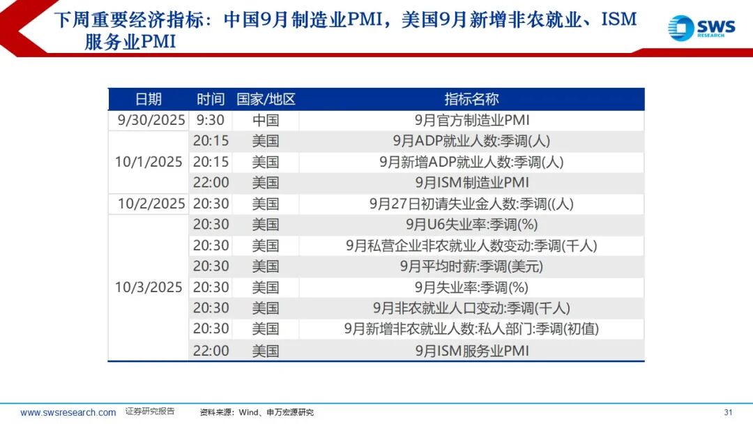 全球经济数据:美国经济:美国8月核心CPI保持平稳,PCE同比边际走强,新房销售和成屋销售同比走强;中国经济:8月份,规模以上工业企业利润同比由上月下降1.5%转为增长20.4%。在宏观政策发力显效、全国统一大市场纵深推进,叠加去年同期低基数等多重因素作用下,规模以上工业企业利润同比增长0.9%,装备制造业支撑有力,不同规模企业利润均有所改善。美联储降息预期:截止2025/9/26, 10月降息25BP概率89.8%,相比于上周的91.9%略微下降;12月降息到3.5%-3.75%的概率为65.1%,相比于上周的78.6%有所下降。下周重要经济指标:中国9月制造业PMI,美国9月新增非农就业、ISM服务业PMI。