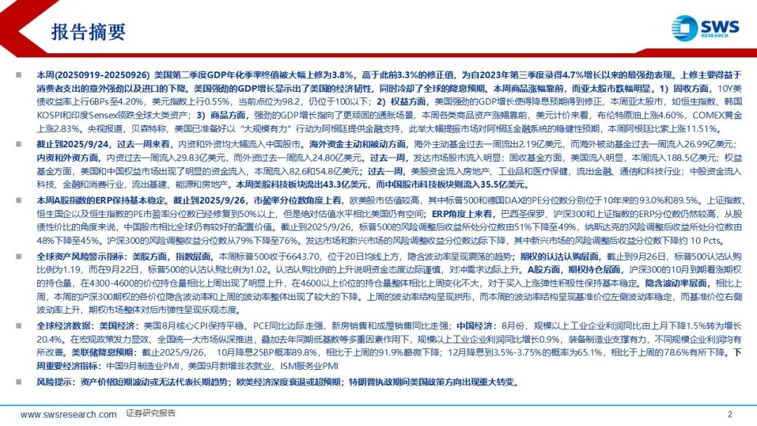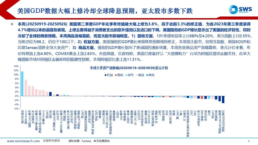 本周(20250919-20250926) 美国第二季度GDP年化季率终值被大幅上修为3.8%,高于此前3.3%的修正值,为自2023年第三季度录得4.7%增长以来的最强劲表现。上修主要得益于消费者支出的意外强劲以及进口的下降。美国强劲的GDP增长显示出了美国的经济韧性,同时冷却了全球的降息预期。本周商品涨幅靠前,而亚太股市跌幅明显。1)固收方面,10Y美债收益率上行6BPs至4.20%,美元指数上行0.55%,当前点位为98.2,仍位于100以下;2)权益方面,美国强劲的GDP增长使得降息预期得到修正,本周亚太股市,如恒生指数、韩国KOSPI和印度Sensex领跌全球大类资产;3)商品方面,强劲的GDP增长指向了更顽固的通胀场景,本周各类商品资产涨幅靠前,美元计价来看,布伦特原油上涨4.60%,COMEX黄金上涨2.83%。央视报道,贝森特称,美国已准备好以“大规模有力”行动为阿根廷提供金融支持,此举大幅提振市场对阿根廷金融系统的稳健性预期,本周阿根廷比索上涨11.51%。