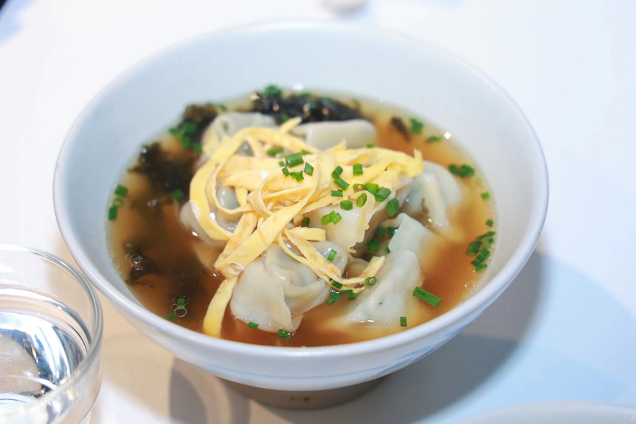 12月10日中午的上海国泰电影院餐厅内,菜肉馄饨端上来时,油香扑鼻,白雾升腾。瓷碗中央,十只白胖胖的馄饨半浮半沉,一口咬下去,翠绿的荠菜与粉嫩的肉糜纠缠可见。金黄的蛋皮丝、紫黑的紫菜、嫩黄的虾皮、翡翠般的葱花,从馄饨汤里传递出的那股熨帖到心窝的暖意,用上海话说是“老乐惠额”——也可以理解为“老落胃的”。